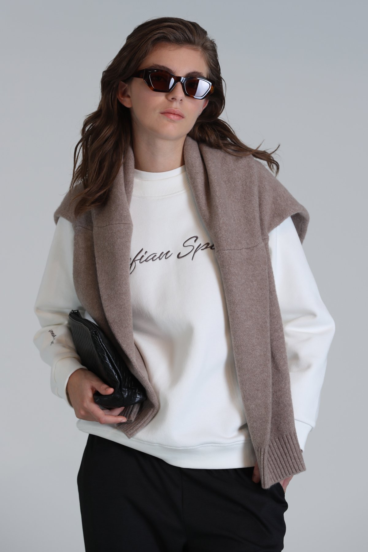Loved Kadın Örme Sweatshırt Kırık Beyaz